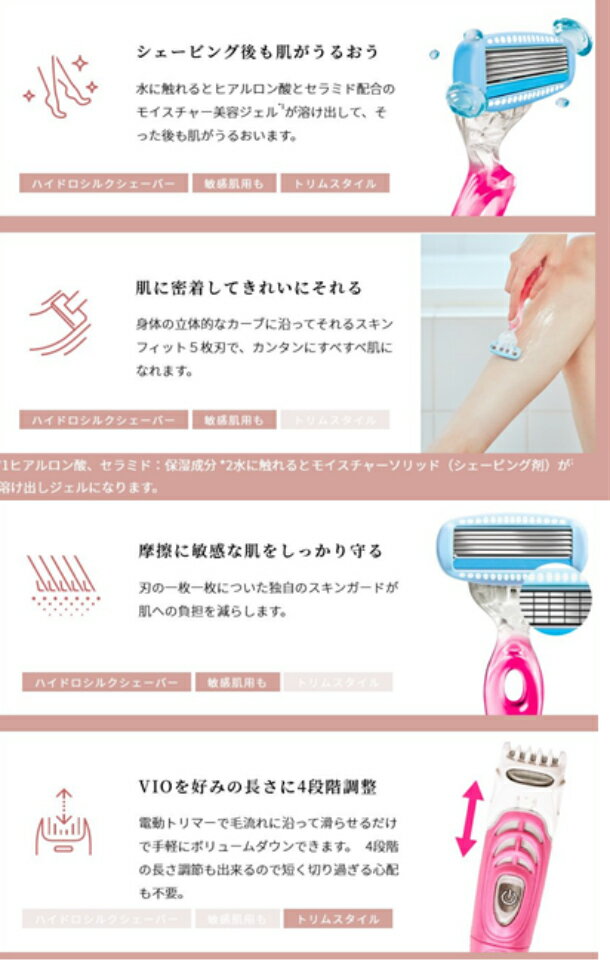 水にふれると溶け出し、そった後も、肌うるおう! ●身体のカーブにそって、簡単にしっかりと剃ることができるスキンフィット5枚刃 ●刃の1枚1枚についた独自のスキンガードが肌への負担を軽減【原材料・成分 】 PEG−115M、ヒドロキシプロピルメチルセルロース、水、酸化チタン、塩化Na、ステアリン酸亜鉛、シア脂、セラミドNG、カミツレ花、(メタクリル酸ラウリル/ジメタクリル酸グリコール)クロスポリマー、シルク、ヒアルロン酸Na、トレハロース、ワカメ 使用上の注意点 ●カミソリは刃物です。