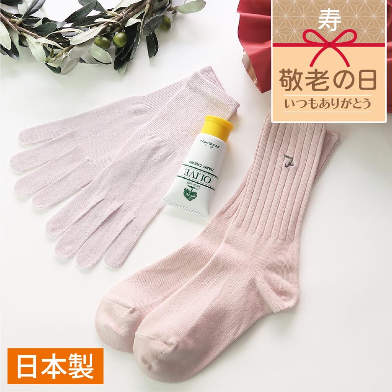 ★敬老の日ギフトに最適★小豆島産ピュアオリーブオイル配合でしっとりやわらかな肌ざわりのやわらか手袋&オリーブサラソックス×人気の鈴虫ハンドクリームの3点セット