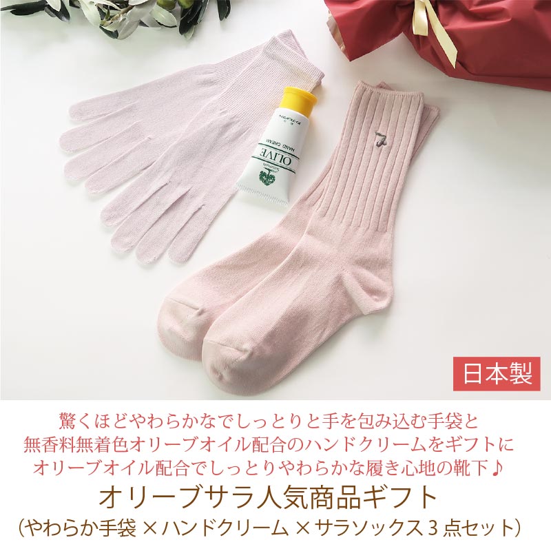 オリーブサラ人気商品ギフト(やわらか手袋×サラソックス×ハンドクリーム)日本製 手荒れ オリーブオイル配合 かかと 高級綿 コーマ糸 無香料無着色 ギフト 贈り物 手荒れ 保湿 ハンドケア 小豆島 鈴虫 四国 香川 ハンドクリーム お母さん 義母 ラッピング付