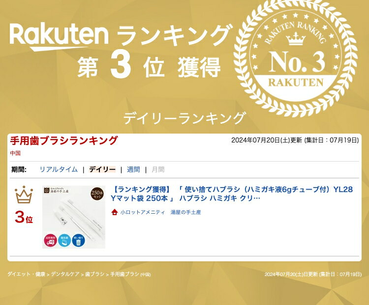 ---------- ■内容量: ハブラシ「YL28 クリアハンドル Yマット袋」(ハミガキ液6gチューブ付)× 250本 ■仕様: 毛材質 / PBT 毛穴数 / 28穴 ■商品サイズ: 約W215mm×H40mm(袋サイズ) 全長約180mm(ハブラシサイズ) ■メーカー名: サンヨーアメニティ ■生産国: 中国 ■広告文責: 株式会社湯屋の手土産 / 097-594-1232 ---------- 【関連キーワード】 <用途> ハミガキ 歯磨き ホテルアメニティ デンタルケア 口腔衛生用 業務用歯ブラシ 業務用ハブラシ 手用歯ブラシ 業務用使い捨て オーラルケア 口腔ケア 口腔衛生ケア 業務用アメニティ 備品 業務用 業務用備品 衛生管理 客室備品 携帯用 携帯 <おすすめのシーン> 旅行 お泊り お泊まり 国内旅行 キャンプ アウトドア 民泊 民泊 介護施設 ネットカフェ ビジネスマン 観光客 旅行客 温泉 温泉宿 公共施設 入浴施設 ホテル 旅館 シティホテル リゾートホテル ビジネスホテル 宿泊施設 研修施設 合宿所 サウナ 銭湯 スパ フィットネス ゴルフ場 会社 店舗 お店 居酒屋 レストラン 飲食店 サロン エステ 歯医者 病院 整体 クリニック 介護 入院 職場 来客用 防災 避難持ち出しグッズ 備蓄 出張 <特徴> 定番 大容量 まとめ買い 大量 個包装 小分け 衛生的 使い捨て ハミガキ粉付き シンプル おしゃれ ハミガキ粉チューブ付き 使い捨てハブラシセット 使い捨て歯ブラシ 小ロット ----------関連商品「使い捨てハブラシ(ハミガキ液3gチューブ付)YL8M Yマット袋 2...「 使い捨てハブラシ(ハミガキ液6gチューブ付)YL28 Yマット袋 ...5,750円2,400円「使い捨てハブラシ(ハミガキ液3gチューブ付)X24 250本」 ハブ...「使い捨てハブラシ (ハミガキ液3gチューブ付)X24 2000本」 ...5,750円30,800円「高級 使い捨て歯ブラシ X24 M袋 250本」 ハブラシ 歯ブラシ...「使い捨てハブラシ(ハミガキ液3gチューブ付)YL8M Yマット袋 1...7,150円2,600円「高級 使い捨て歯ブラシ X24 M袋 100本」 歯ブラシ 歯みがき...「インスタントハブラシ バイオマス 500本セット」歯ブラシ インスタ...3,100円7,300円「 使い捨てハブラシ(ハミガキ液3gチューブ付)X24 100本 」 ...「インスタントハブラシ バイオマス 100本セット」歯ブラシ インスタ...2,600円2,200円。