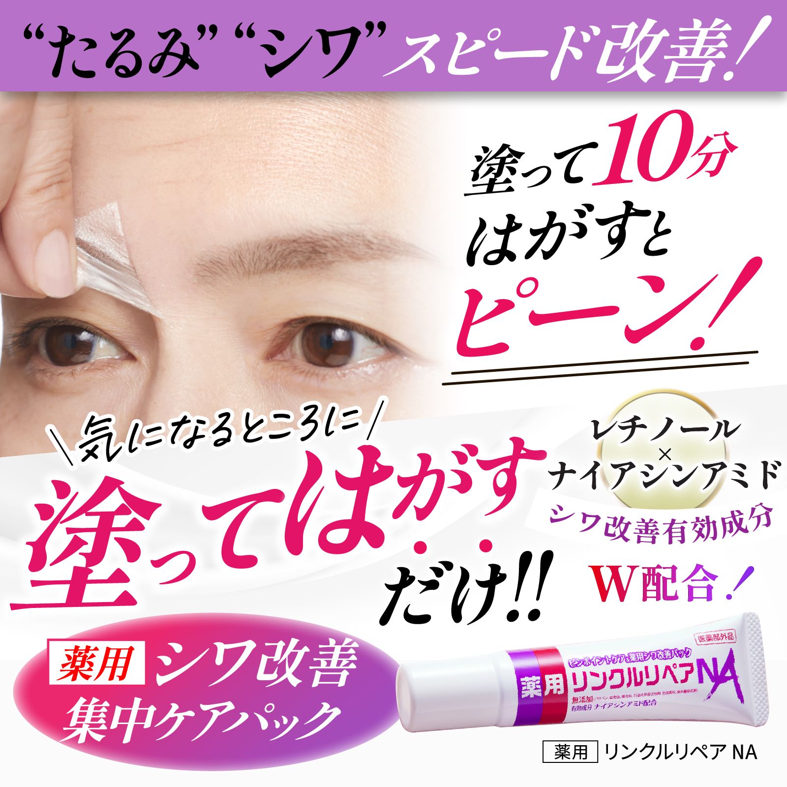 【こんなお悩みがある方におススメ】 ・眉間やおでこ、目尻のシワが気になる ・ほうれい線が気になる ・目元のたるみが気になる そんなお悩みに!! 薬用リンクルリペアNAでシワやたるみを集中ケア! 【W集中ケア】 1.「ピーンとした肌を形状記憶」 パックが乾くにつれて、シワを伸ばしてクセづけながらピーンとした肌を形状記憶! 2.「高機能シワ改善成分」が真真皮層まで集中浸透! レチノール × ナイアシンアミド 等の高機能シワ改善成分を濃厚なパックで密封して真真皮層まで集中浸透! さらに、コラーゲン・セラミドなどの美容成分38種配合で透明感やハリもUP!使い続けることで美白効果も! 【6つの無添加処方】 (合成香料・パラベン・鉱物油・タール系色素・石油系界面活性剤・紫外線吸収剤) お肌に優しく安心してお使いいただけます。