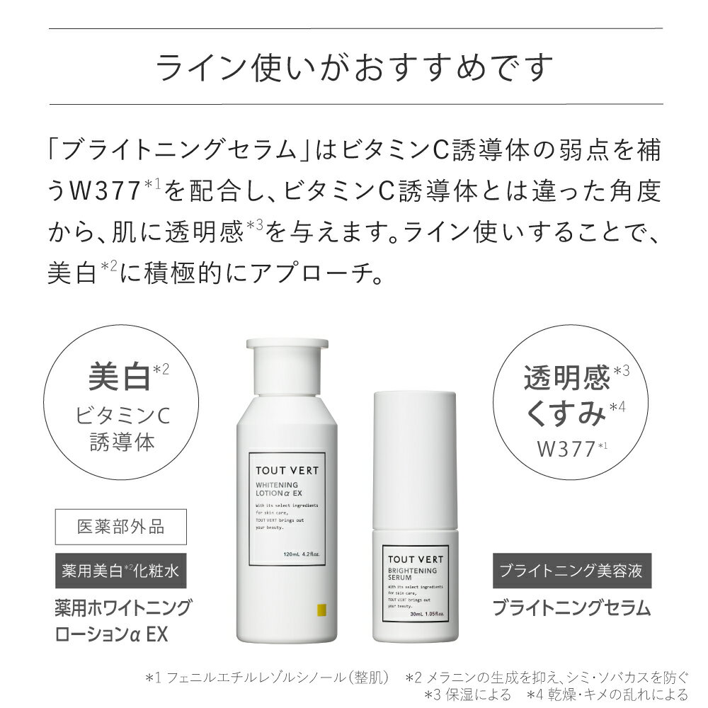 * 日焼けによる 商品内容量 ブライトニングセラム:30mL 全成分 【ブライトニングセラム】 水 、BG(保湿)、グリセリン(保湿)、α−アルブチン(透明感アップ)、3-O-エチルアスコルビン酸(ビタミンC誘導体、透明感アップ)、パンテノール(透明感アップ)、水添レシチン(乳化剤)、フェニルエチルレゾルシノール(ポリフェノール、透明感アップ)、グラブリジン(透明感アップ)、カンゾウ根エキス(透明感アップ) 、サクシノグリカン(保湿)、ヒアルロン酸Na(保湿)、シロキクラゲ多糖体(保湿)、マルチトール(保湿)、ヒナギク花エキス(肌の保護)、オウゴン根エキス(保湿)、アロエベラ葉エキス(肌の保護)、クズ根エキス(保湿)、クロレラエキス(保湿)、セイヨウオオバコ種子エキス(保湿)、ブドウつるエキス(肌の育成)、シリカ(保湿)、EDTA−2Na(金属イオン封鎖剤)、クエン酸(pH調整剤)、クエン酸Na(pH調整剤)、カラメル(多糖類、保湿)、加水分解ローヤルゼリータンパク(保湿)、カッパフィカスアルバレジエキス(保湿)、メチルパラベン(防腐剤)、プロピルパラベン(防腐剤) 使用目安 ・ブライトニングセラム: 室温保存(未開封1年、開封後6ヶ月) ・薬用ホワイトニングローションαEX: 室温保存(未開封1年、開封後3ヶ月) ※全成分変更のお知らせ:セイヨウナシ枝エキスの原料廃盤に伴い全成分から削除しております。