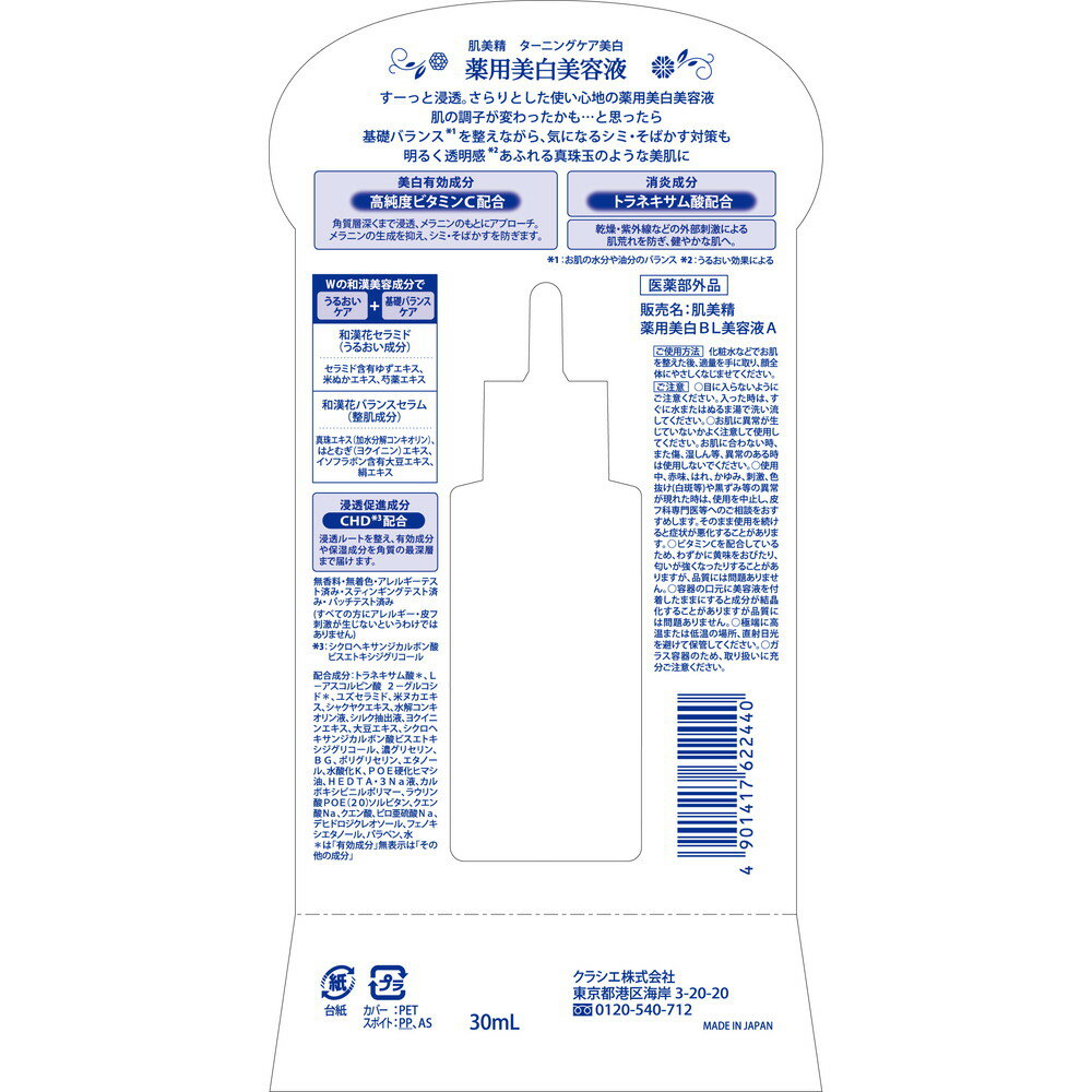 商品名肌美精 ターニングケア美白 薬用美白美容液 [医薬部外品] 内容量30mL 商品説明(製品の特徴)●美白有効成分「高純度ビタミンC」と消炎成分「トラネキサム酸」のW有効成分の美白美容液●うるおいケアと同時に肌の基礎バランスからケア。