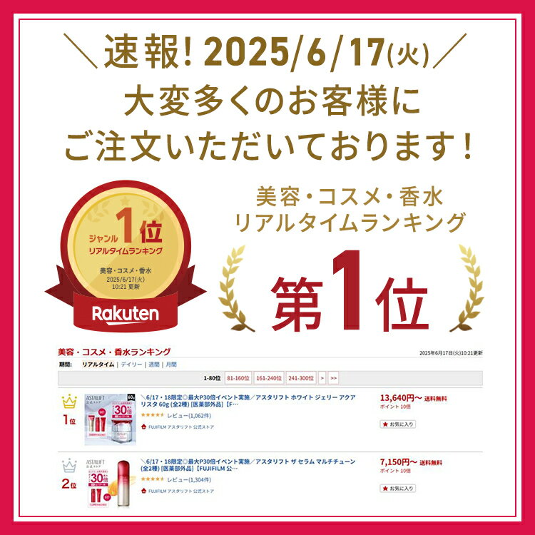 ギフトラッピング 申込手順はこちら◎美白有効成分 アルブチン ◎うるおい成分 Wヒト型ナノセラミド、ナノAMA+、ナノアスタキサンチン マロニエエキス、ビルベリー葉エキス、3種のコラーゲン、アセンヤクエキス ◎全成分 【ホワイトジェリーアクアリスタ】 有効成分:アルブチン その他の成分:ベタイン、ポリエチレングリコール・デシルテトラデセス−20・ヘキサメチレンジイソシアネート共重合体、濃グリセリン、BG、アスタキサンチン液、N−アセチル−L−ヒドロキシプロリン、水溶性コラーゲン液、コラーゲン・トリペプチド F、N−オレオイルフィトスフィンゴシン、ヒドロキシステアリルフィトスフィンゴシン、ステアロイルオキシヘプタコサノイルフィトスフィンゴシン、ツボクサエキス、フェルラ酸、ビルベリー葉エキス、カンゾウ葉エキス、アセンヤクエキス、マロニエエキス、天然ビタミンE、グリセリン、香料、ステアロイルグルタミン酸Na、グリセリンエチルヘキシルエーテル、イソステアリン酸、BHT、POE・POPデシルテトラデシルエーテル、オレイン酸、グリセリン脂肪酸エステル、メチルパラベン、コレステロール、ミリスチン酸デカグリセリル、大豆リン脂質、ピロ亜硫酸Na、フェノキシエタノール、水酸化Na、オレイン酸ポリグリセリル、ショ糖脂肪酸エステル、ルチングルコシド、無水エタノール 【アドバンスドローション】 水、ベタイン、グリセリン、PEG−32、ワセリン、異性化糖、グリチルリチン酸2K、トコフェロール、ヘマトコッカスプルビアリス油、トマト果実エキス、アセチルヒドロキシプロリン、加水分解コラーゲン、水溶性コラーゲン、グルコシルルチン、プテロカルプスマルスピウム樹皮エキス、リン酸アスコルビルMg、クエン酸、ステアリン酸スクロース、レシチン、香料、イソノナン酸イソトリデシル、オレイン酸ポリグリセリル−10、トリ(カプリル酸/カプリン酸)グリセリル、水酸化Na、BG、クエン酸Na、ダマスクバラ花油、ミリスチン酸オクチルドデシル、ミリスチン酸ポリグリセリル−10、ステアリン酸ポリグリセリル−2、フェノキシエタノール、メチルパラベン 【アドバンスドクリーム】 水、BG、ワセリン、水添ポリデセン、メドウフォーム油、グリセリン、ジカプリン酸ネオペンチルグリコール、テトライソステアリン酸ペンタエリスリチル、ジフェニルシロキシフェニルトリメチコン、セタノール、ペンチレングリコール、ステアリン酸ポリグリセリル−6、ジメチコン、ステアリン酸グリセリル(SE)、トコフェロール、ステアリン酸グリセリル、ステアリン酸ポリグリセリル−5、ステアロイルグルタミン酸Na、水添レシチン、グリチルリチン酸2K、ヘマトコッカスプルビアリス油、トマト果実エキス、アセチルヒドロキシプロリン、加水分解コラーゲン、水溶性コラーゲン、プテロカルプスマルスピウム樹皮エキス、セイヨウシロヤナギ樹皮エキス、クエン酸、ダマスクバラ花油、カルボマー、キサンタンガム、水酸化K、イソノナン酸イソトリデシル、オレイン酸ポリグリセリル−10、レシチン、トリ(カプリル酸/カプリン酸)グリセリル、ステアリン酸スクロース、ミリスチン酸オクチルドデシル、ミリスチン酸ポリグリセリル−10、ステアリン酸ポリグリセリル−2、香料、フェノキシエタノール、エチルヘキシルグリセリン 【マルチチューン】 ナイアシンアミド、トレハロース、メチルポリ シロキサン、デカメチルシクロペンタシロキサン、エタノール、植物性スクワラン、 ショ糖脂肪酸エステル、親油型モノステ アリン酸グリセリル、モノオレイン酸ポリグリセリル、ポリオキシエチレンフィトステ ロール、アスタキサンチン液、天然ビタミ ンE、ビタミンCテトライソパルミテート、 無水カフェイン、コレステロール、大豆リン脂質、N-ステアロイル-L-グルタミン酸ナトリウム、水素添加大豆リン脂質、無水リン酸一水素ナトリウム、リン酸二水素ナトリウム、無水エタノール、パラオキシ安息香酸エステル、香料 *楽天ランキング1位受賞 美容・コスメ・香水 ジャンル デイリーランキング [2024年11月30日(土)更新(集計日:11月29日)] 2025年1〜3月ホワイト ジェリー シリーズ 楽天販売個数 累計実績 2,372個。