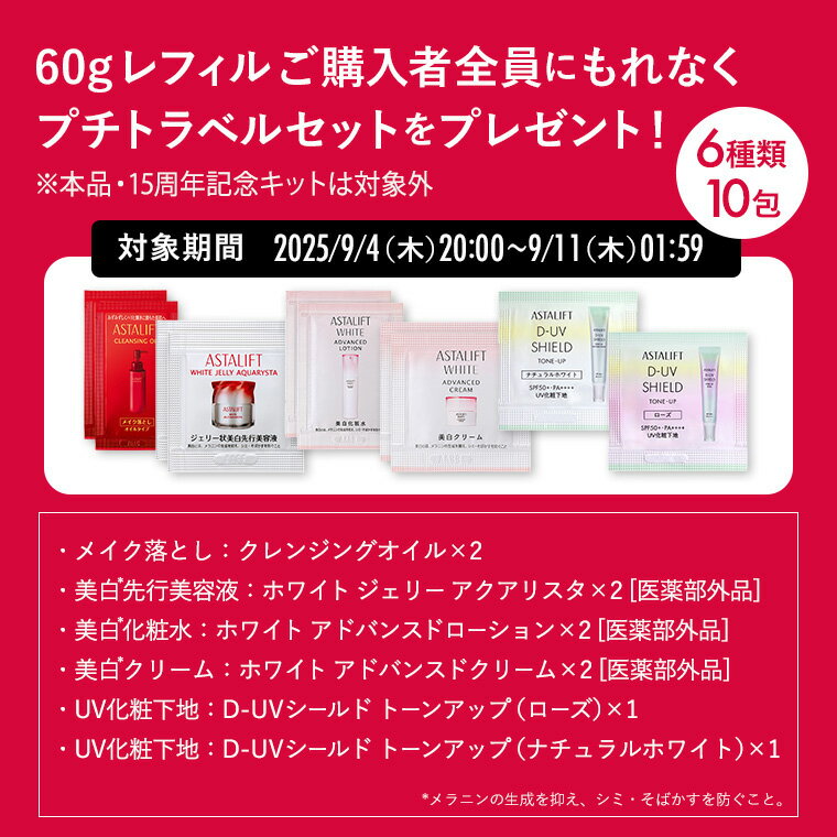 商品名 アスタリフト ホワイト ジェリー アクアリスタ <美白先行美容液> 販売名 AL ジェリーホワイトe 内容量 60g:本品1個 60g(15周年限定キット):本品60g、ミニ7g、オリジナルポーチ 60gレフィル:レフィル1個 全成分 詳しくはページ内の【成分】からご確認ください。