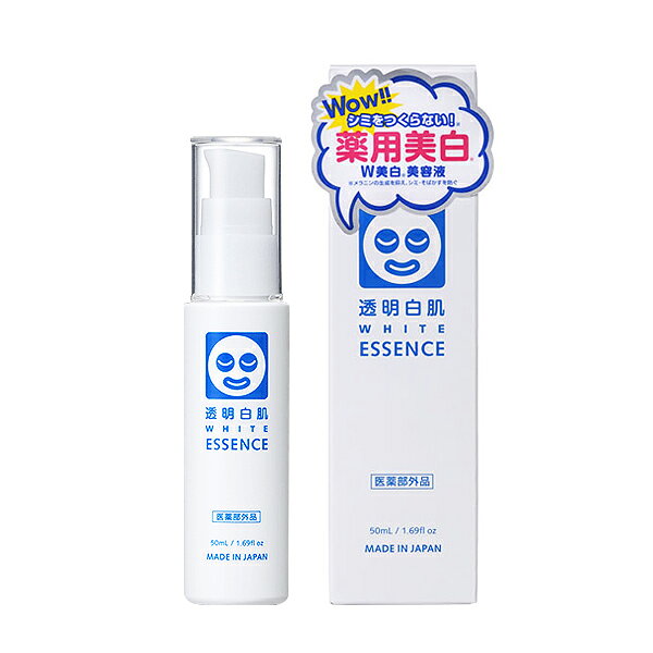 白肌をシミから遠ざける 薬用美白(※)美容液 透明白肌 薬用Wホワイトエッセンス 50ml 医薬部外品 じわじわ広がるシミ(※)悩みに、毎日使ってブロック実感! 2つの美白(※)成分「アルブチン」「ビタミンC誘導体」と、ぷるぷる透明美肌成分(保湿:ヒアルロン酸・コラーゲン・植物エキス)を配合。